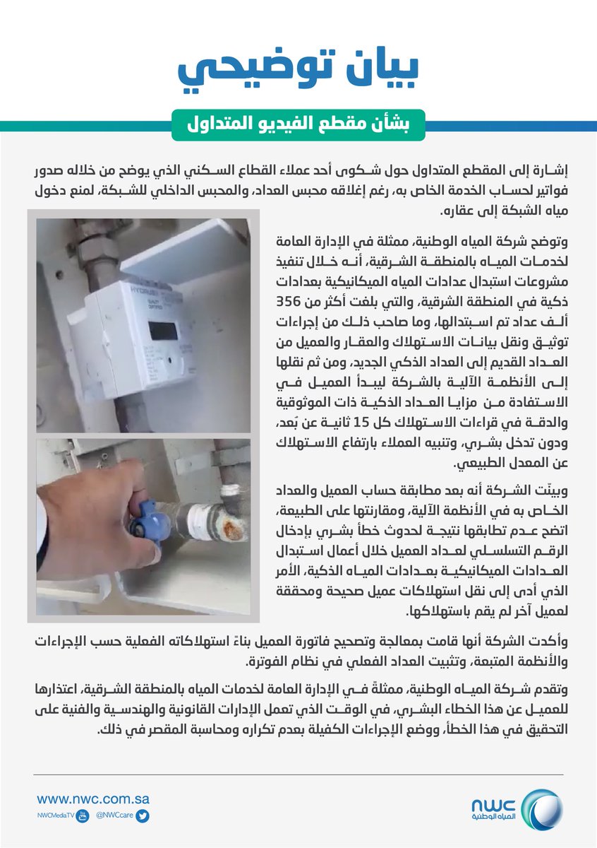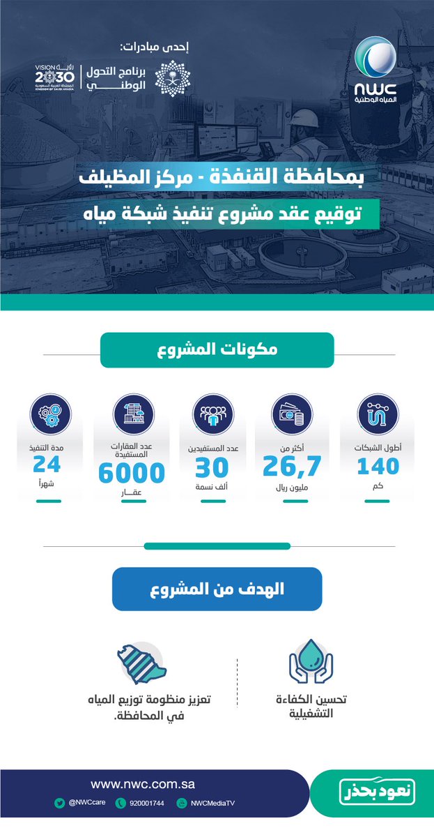 شركة المياه الوطنية تويتر. وأوضحت أن التغيير تم بعد انضمام المنطقتين إليها. أعلنت شركة المياه الوطنية عبر حسابها الرسمي على موقع تويتر للتدوينات القصيرة تغيير رسوم سداد خدمات المياه في منطقتي المدينة المنورة وتبوك. أعلنت شركة المياه الوطنية تغيير رمز سداد خدمات المياه إلى 138 ابتداء من اليوم في منطقتي المدينة المنورة وتبوك. شركة المياه الوطنية هي شركة مساهمة سعودية مملوكة بالكامل للدولة متمثلة في صندوق الاستثمارات العامة وتقدم خدمات المياه والصرف الصحي و فق ا لأحدث المعايير العالمية بتضافر جهود الكوادر الوطنية مع نخبة من المشغلين.