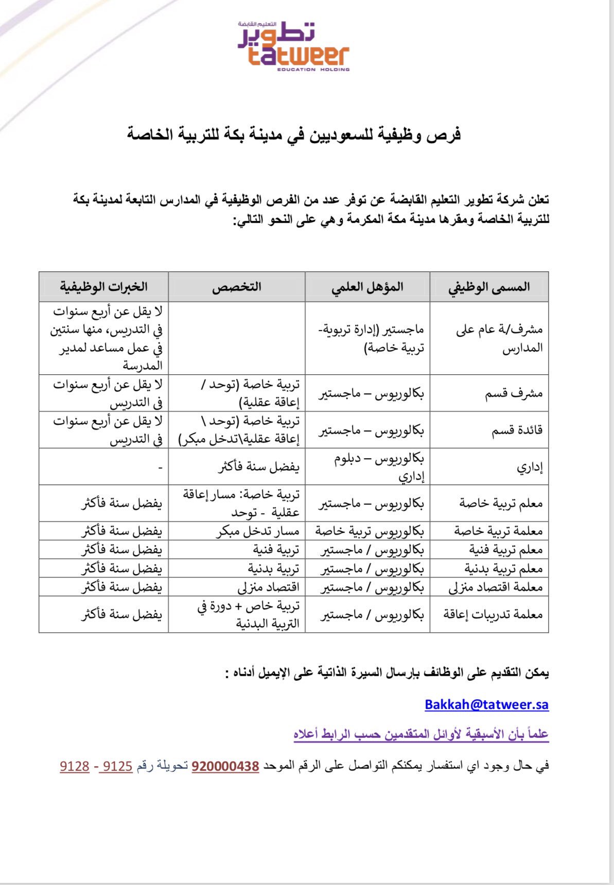 أعلنت شركة تطوير التعليم القابضة عن توفر وظائف تعليمية وإدارية ومساعدي معلمين للرجال والنساء في مدينة سناد للتربية الخاصة بمكة المكرمة مدينة بكة للتربية الخاصة سابقا لحملة البكالوريوس حديثي التخرج وذوي.