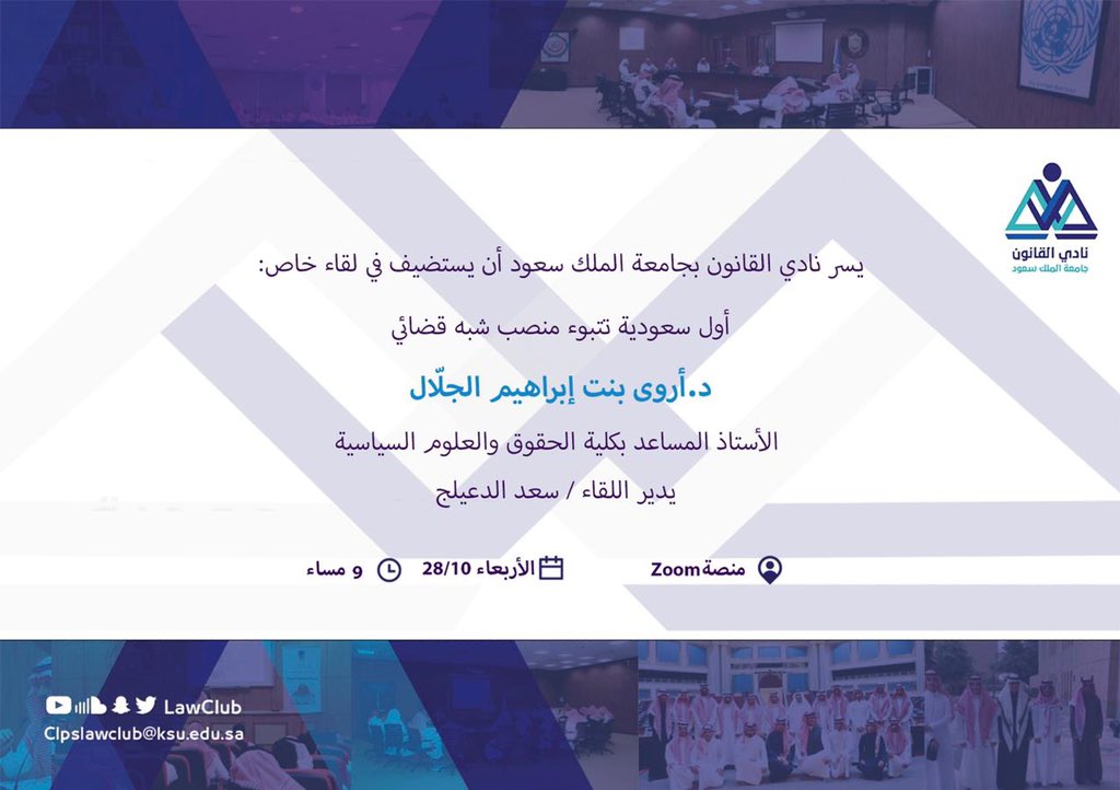 شعار كلية الحقوق والعلوم السياسية جامعة الملك سعود. اسم جامعة الملك سعود درع جامعة الملك سعود متضمنا النخلة السيفين الكتاب وسنة التأسيس 1957 م الشكل الذى يحوي اسم جامعة الملك سعود باللغتين شكل مستطيل مع استدارة أسفل الزاوية. نوره عبدالرحمن اليوسف وكيلة كلية الحقوق والعلوم السياسية هاتف. كلية الحقوق والعلوم السياسية. فهد بن إبراهيم الضويان أستاذ أضغط هنا أ د.